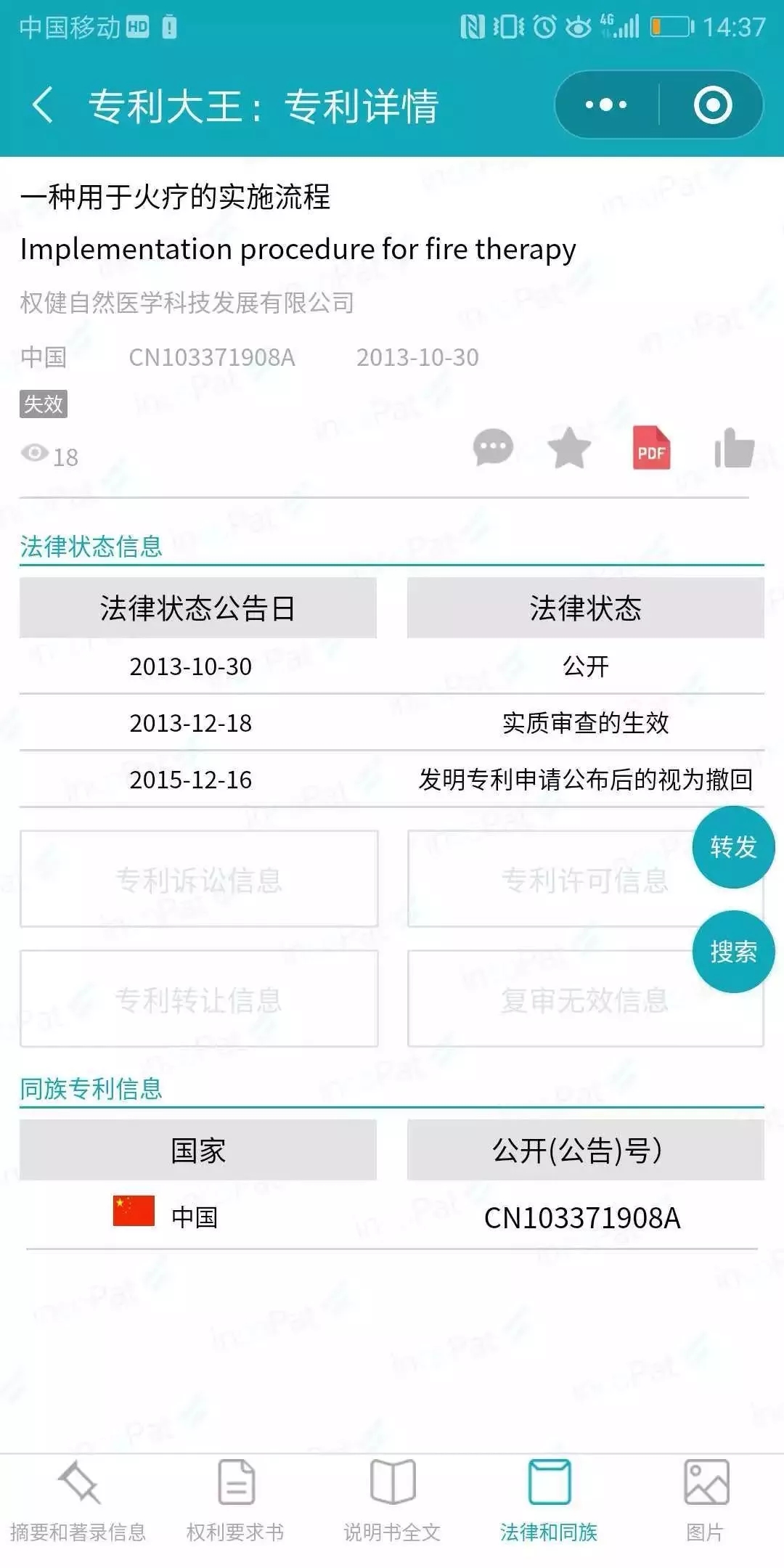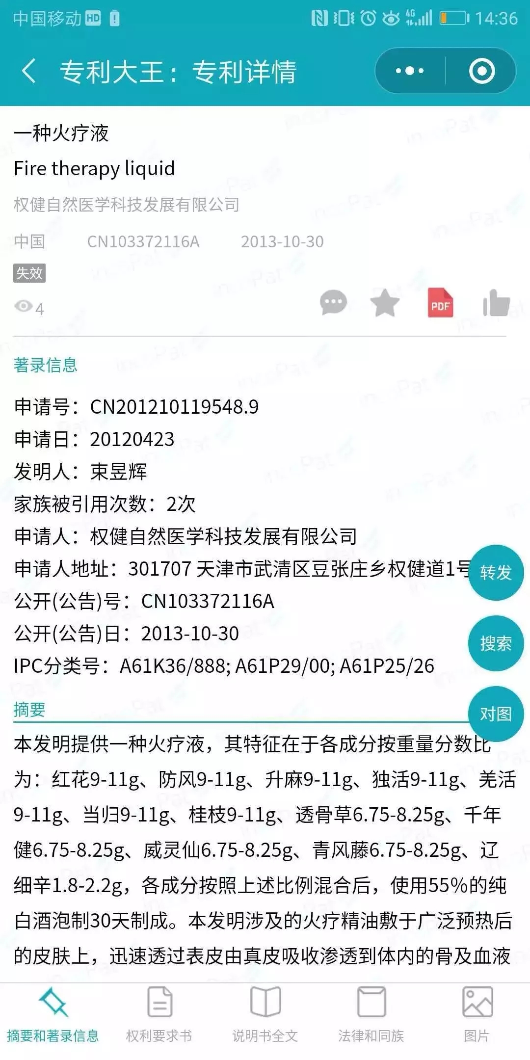 為此,筆者特意對其提到三項專利進行了查詢。在微信小程序專利大王中,以發(fā)明人“束昱輝”和標題摘要“火療”為檢索條件進行專利檢索,命中有3篇專利,而其中的“一種用于火療的實施流程(專利號CN103371908)”和“一種火療液(專利號CN103371908)”均申請于2012年4月23日,在2013年10月30日進行公開,不過兩篇均在2015年12月16日變更為“發(fā)明專利申請公布后的視為撤回”。