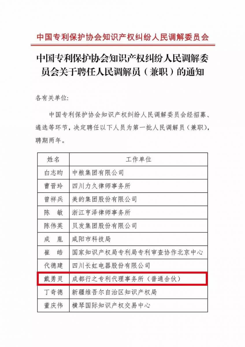 中國專利保護協(xié)會知識產(chǎn)權(quán)糾紛人民調(diào)解委員會經(jīng)招募、遴選等環(huán)節(jié),決定聘任以下人員為第一批人民調(diào)解員(兼職),聘期兩年。其中,行之知識產(chǎn)權(quán)服務集團共有8人被聘任。原文如下:...